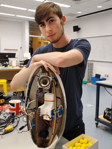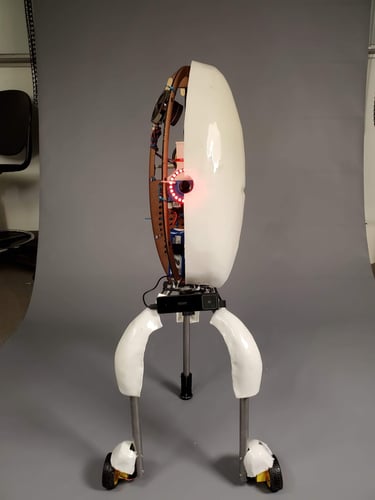 An exercise in both aesthetic modeling and robotics controls, I led the mechanical subteam in creating self-contained autonomously roaming robotic system in a four week sprint. The body of the robot was modeled in Blender, and the frame in SolidWorks. A shell was thermoformed from a CNC machined buck, and secured via embedded magnets to a laser-cut hardboard frame. In its final iteration, the dispenser block was capable of launching NERF projectiles over 25 m/s.